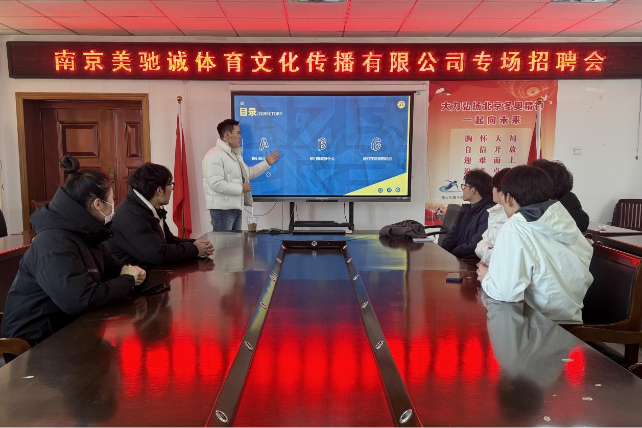 12月27日,学院在三楼会议室举行2026届毕业生专场招聘会,邀请南京美驰诚体育文化传播有限公司进行就业宣讲和招聘。学院就业秘书和体育专业专项班毕业生参加招聘活动。