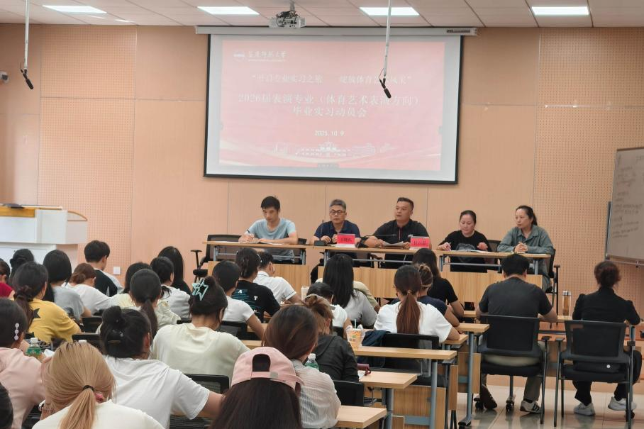 10月9日,体育学院在体育馆多媒体教室召开2026届表演(体育艺术表演方向)专业毕业实习动员会议,旨在明确实习任务要求,强调安全纪律规范,部署实习保障措施。体育学院副院长王晓东、副书记杜百忍、专业负责人潮芳、专职辅导员沈春华、实习秘书章京京及全体实习指导教师、2026届表演专业实习学生参加会议。
